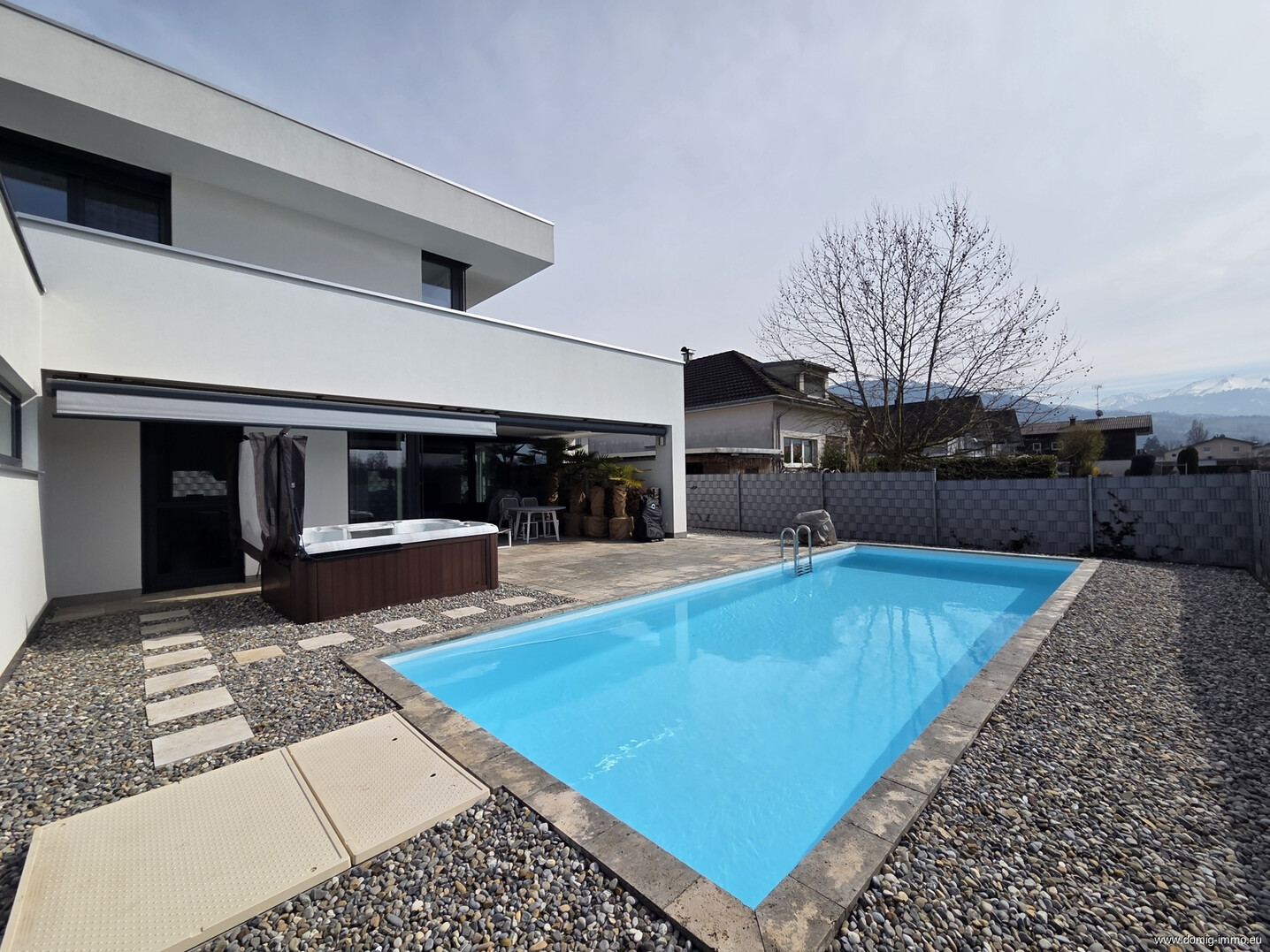Auch im Außenbereich bietet die Immobilie zahlreiche Highlights: Eine großzügige Terrasse mit Swimmingpool lädt zum Entspannen und Verweilen ein, während ein Jacuzzi zusätzlichen Komfort für Wellnessmomente bietet. Eine weitere Terrasse im Obergeschoss schafft einen privaten Rückzugsort mit schönem Ausblick.