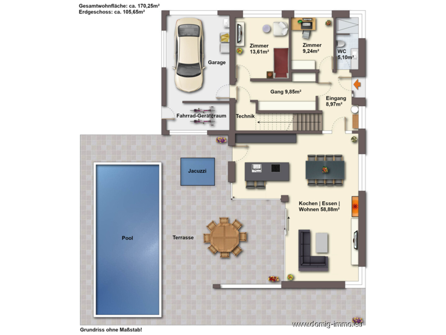 Sehr gepflegtes Einfamilienhaus mit rund 170 m² Wohnfläche, hochwertiger Ausstattung und großzügigem Wohnbereich. Großzügige Terrassen, Swimmingpool, Jacuzzi sowie moderne Haustechnik sorgen für höchsten Wohnkomfort. Das Anwesen befindet sich auf einem insgesamt 1.500 m² großen Grundstück. |