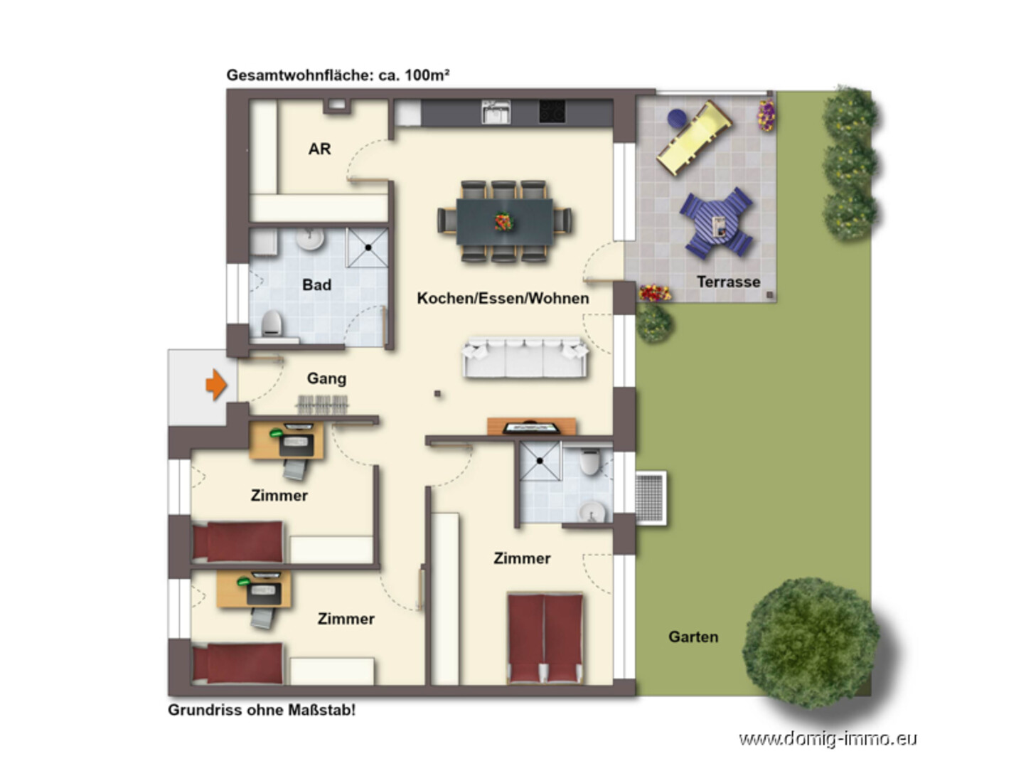 Die Wohnung ist Aufgeteilt in einen großzügigen, hellen Wohnbereich (Küche nicht im Preis enthalten), drei Kinderzimmer, ein großes Badezimmer mit Fenster, ein Elternschlafzimmer mit separatem Badezimmer und Zugang zur Gartenterrasse.
