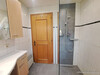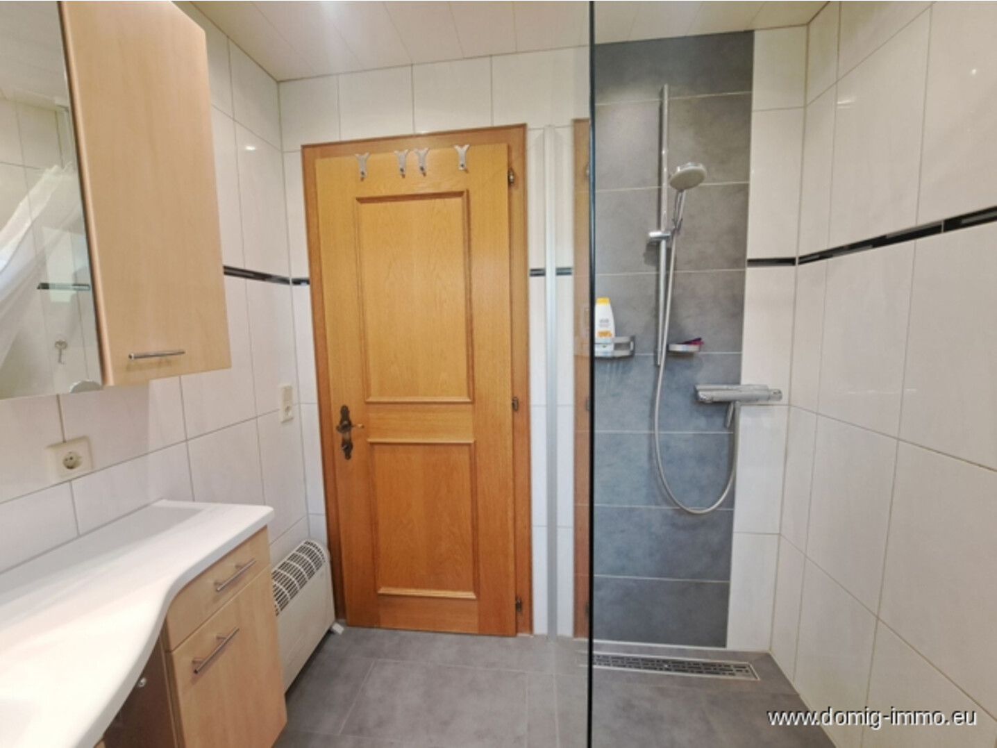 Modernisiertes Badezimmer mit bodengleicher Dusche, Ablaufrinne, Einbaumöbeln und großzügigem Waschtisch